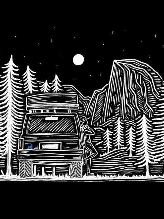 On the left are some of the logo sketches and early Illustrator explorations I created while working toward the two final directions. On the right is the shirt concept I also have been working on for their opening day, featuring Yosemite’s Half Dome and a small van, as requested.
